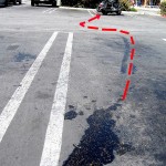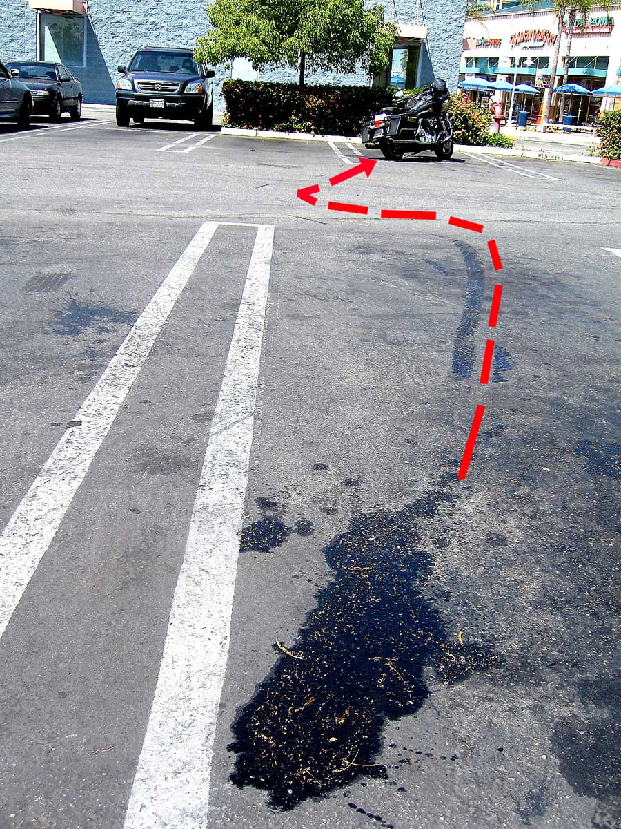 Call me Captain Obvious if you want, but the red dashed line shows my path through my little adventure. The skid from the rear tire is obvious, but if you look carefully you’ll see the oil tracks from the front tire too to the left of the red line.
