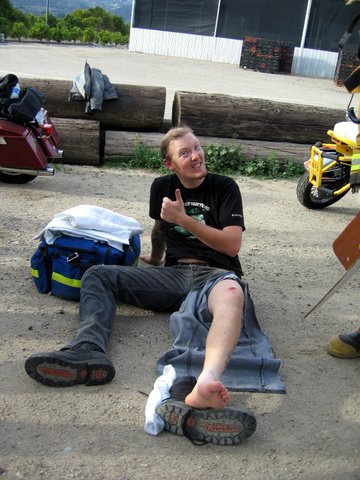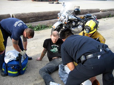 I called my buddy up on the cell, told him what was going on, and got the report from his end: his bike had a few minor scratches on the fork cover, but aside from that it was fine. He actually kinda wanted to let the whole thing go because he thought the accident was his fault and he didn’t want it on his insurance.